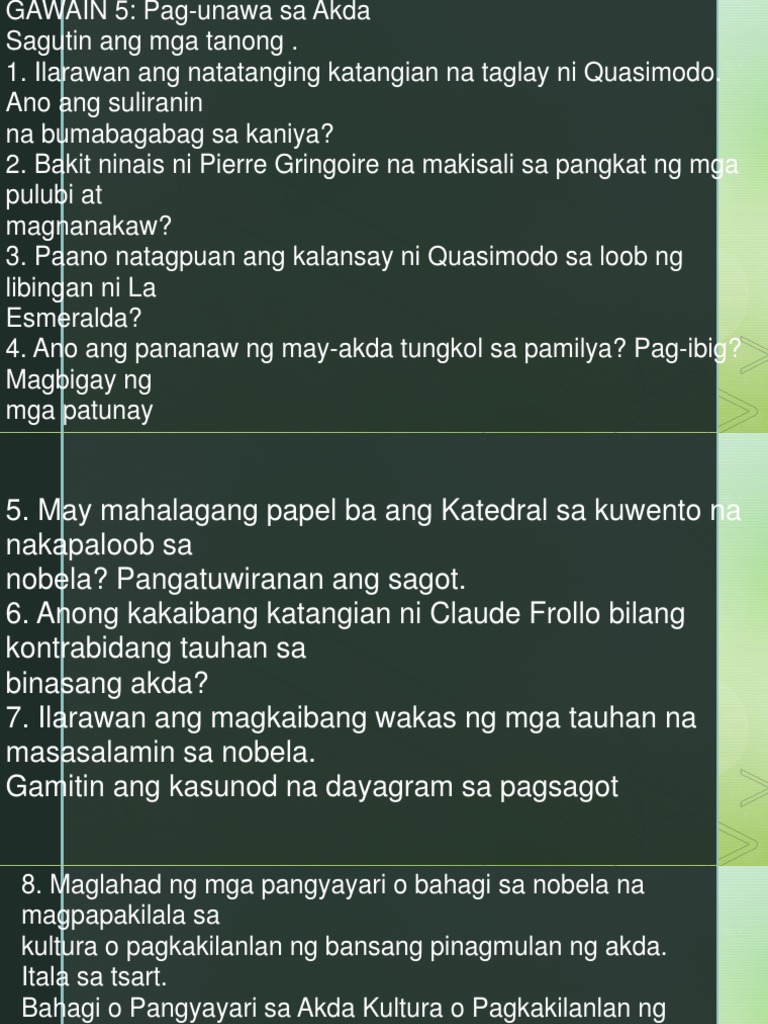 Pag-unawa sa Akoa Sagutin ang mga tanong 1 larawan ang natatanging katangian na taglay ni Quasimodo. Bakit ninais ni Pierre Gringoire na makisali sa pangkat ng mga pulubi at magnanakaw. Paano naipamalas ng may-akda ang masidhing pagmamahal.